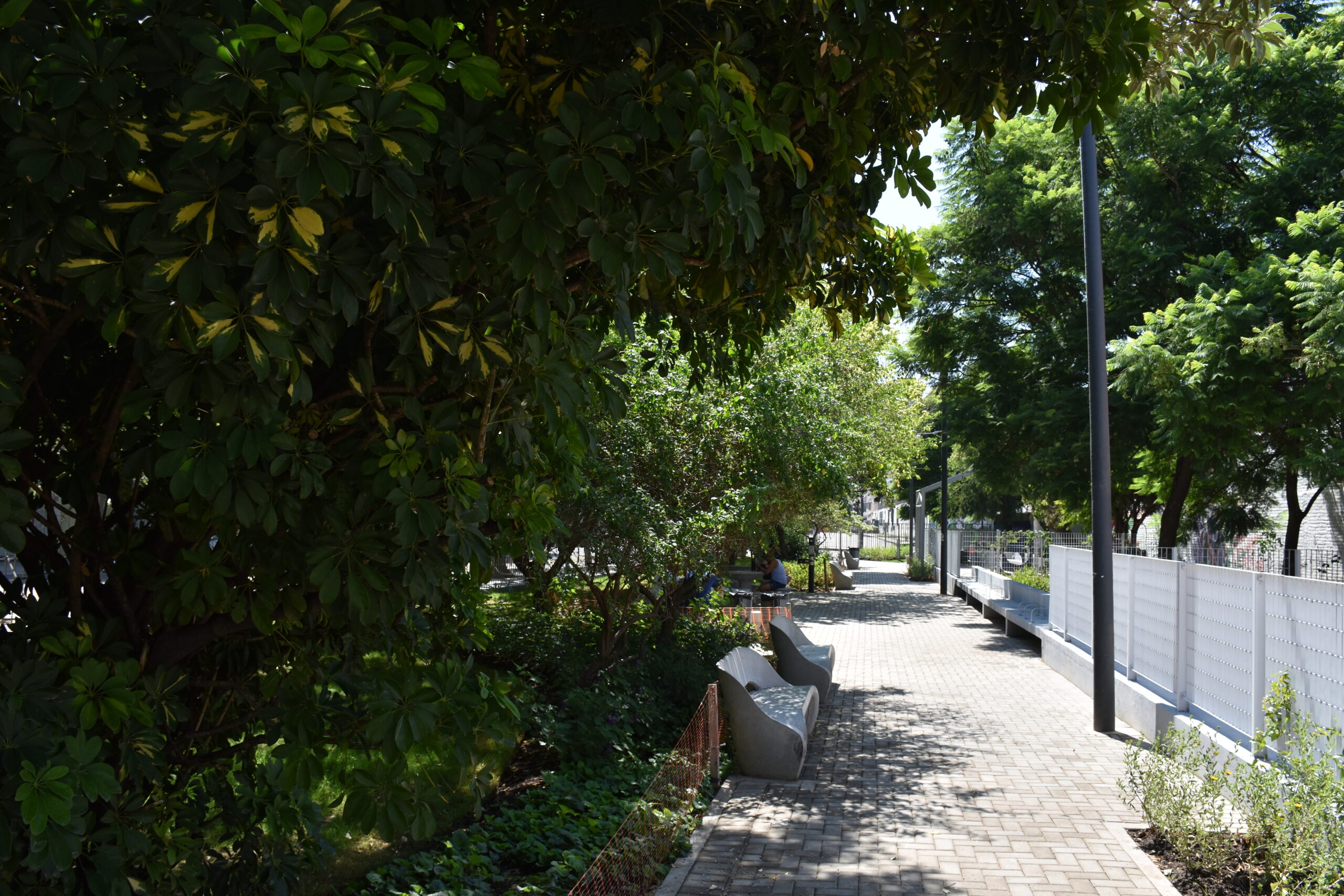 La reforma redefinió la circulación mediante solado intertrabado y rampas acordes a la normativa vigente, unificando criterios de diseño y materiales. También se renovó el mobiliario urbano —bancos, cestos, bebederos y señalética— y se desarrolló una propuesta paisajística basada en especies nativas que aportan aromas y texturas, al tiempo que se realizaron tareas de poda y despeje para mejorar la visibilidad.
