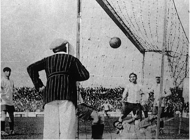 | El primer gol «olímpico», convertido por Cesáreo Onzari en un Argentina-Uruguay jugado en Sportivo Barracas en 1924. |