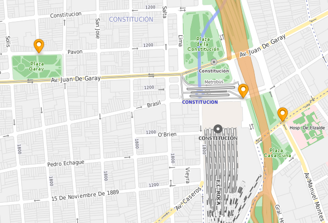 Foto: el plano oficial mapabuenoaires.gob.ar, con los tres puntos en los cuales se produjeron los episodios narrados en la nota.